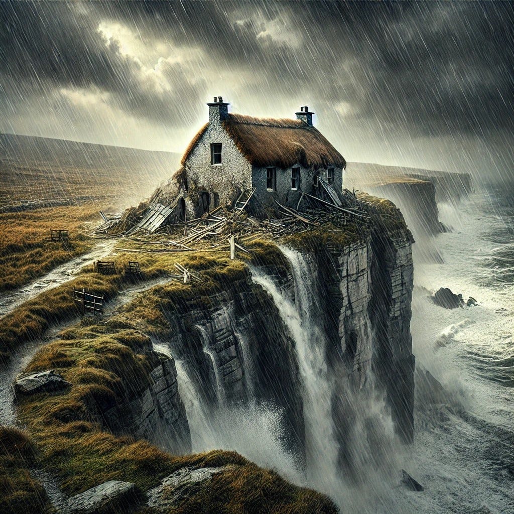 Not long after Eoin moved into his cottage, a huge storm came menacingly from the Atlantic. The storm raged on and on and high winds blew so badly that they took off the roof Eoin had so lovingly covered his cottage with.