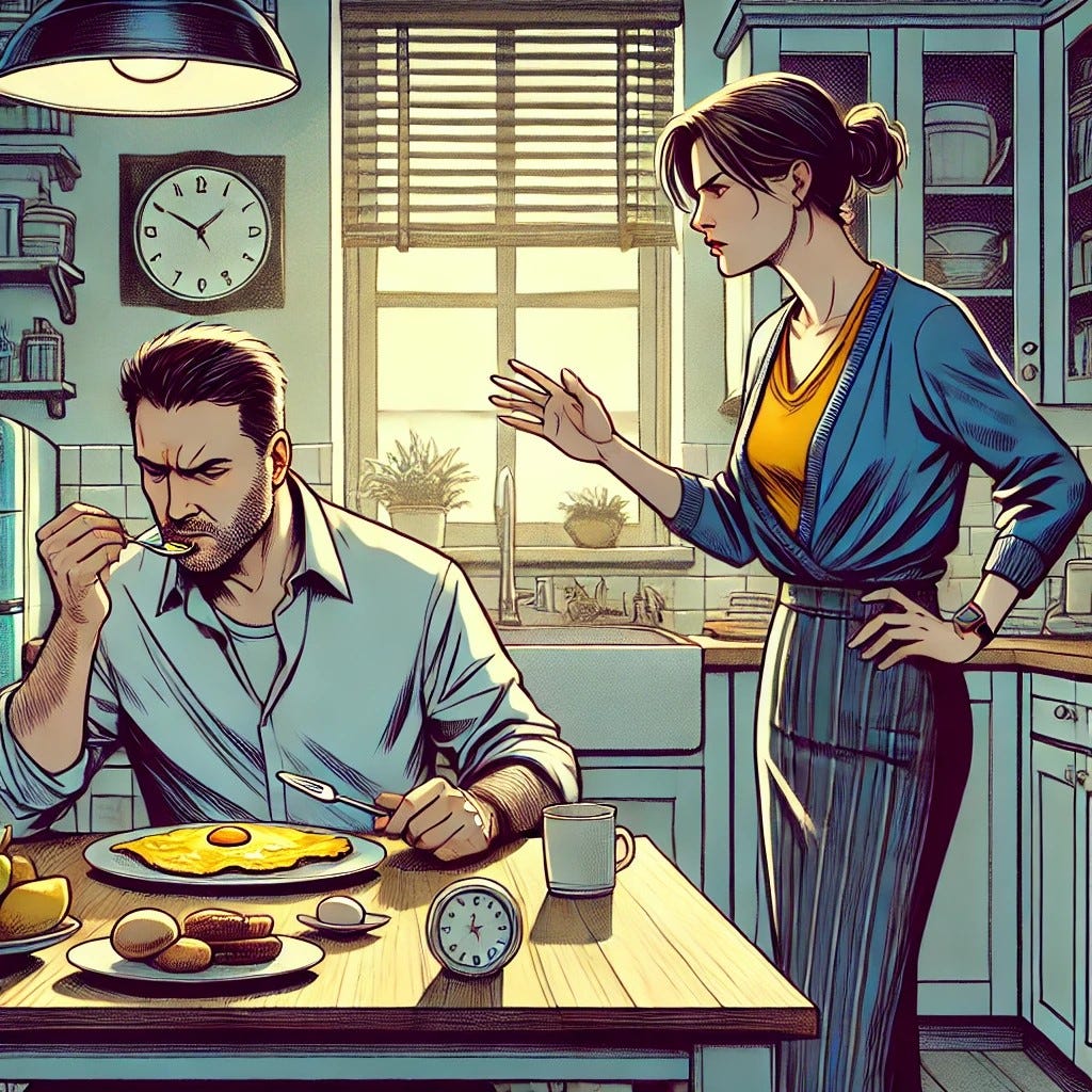 His silence annoyed Maureen even more so, she started moving things around noisily, making sure he could not have a pleasant meal.