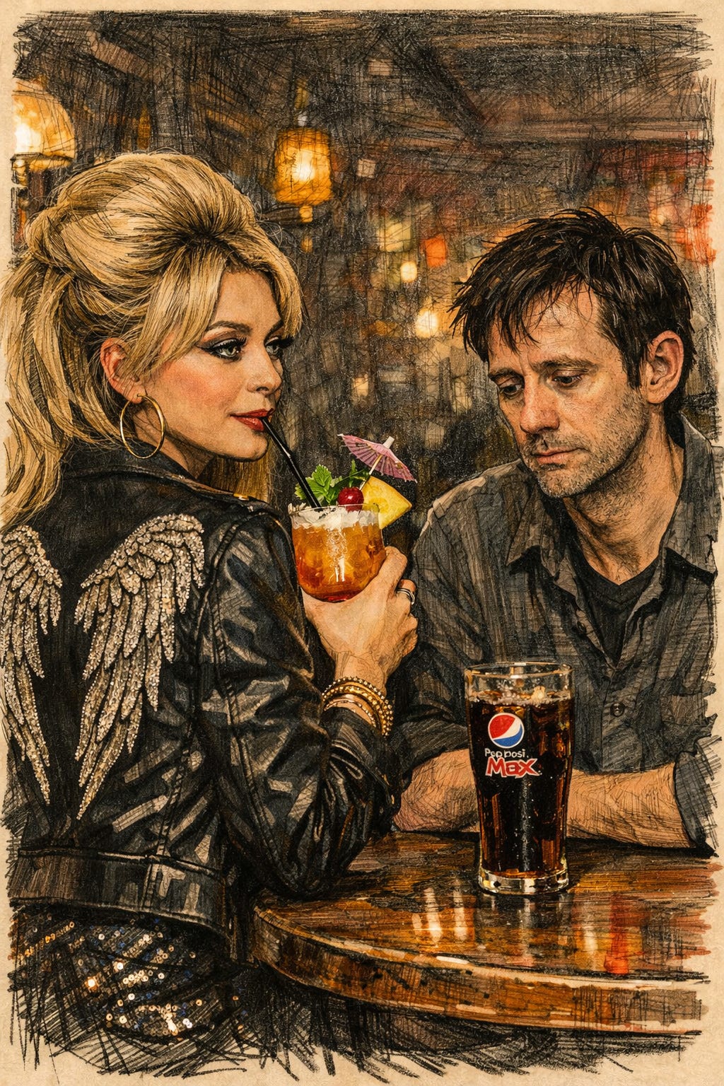 As he was slowly sipping his drink he felt the light change, and when he turned to the chair next to him he was faced with an unusually beautiful, but very adorned, young woman.