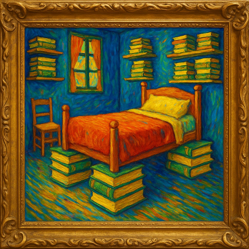 Howard laughed at himself looking at the stacks of books supporting his bed: