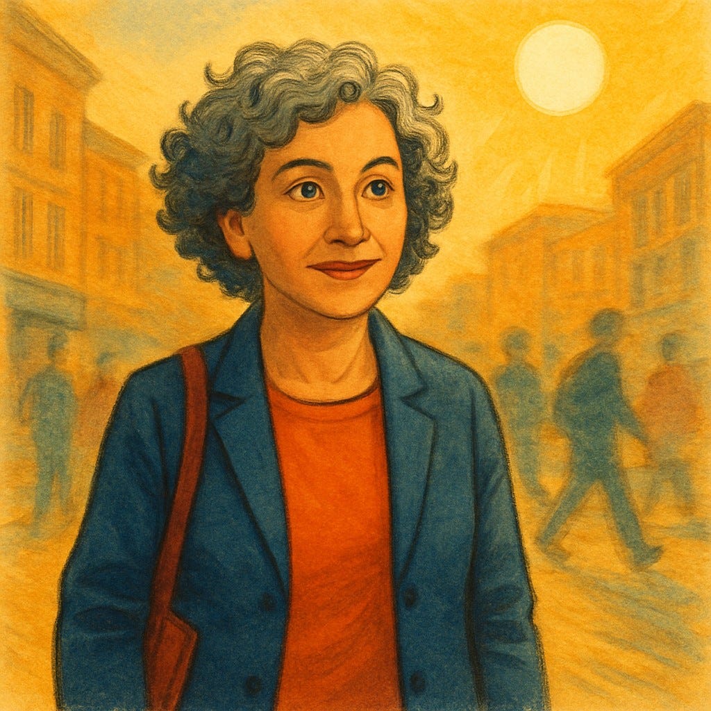 At her stop, Moira patiently waits to get off, and then rejoices to find herself in the breezy sunlight. As the day progresses the sun becomes friendlier.